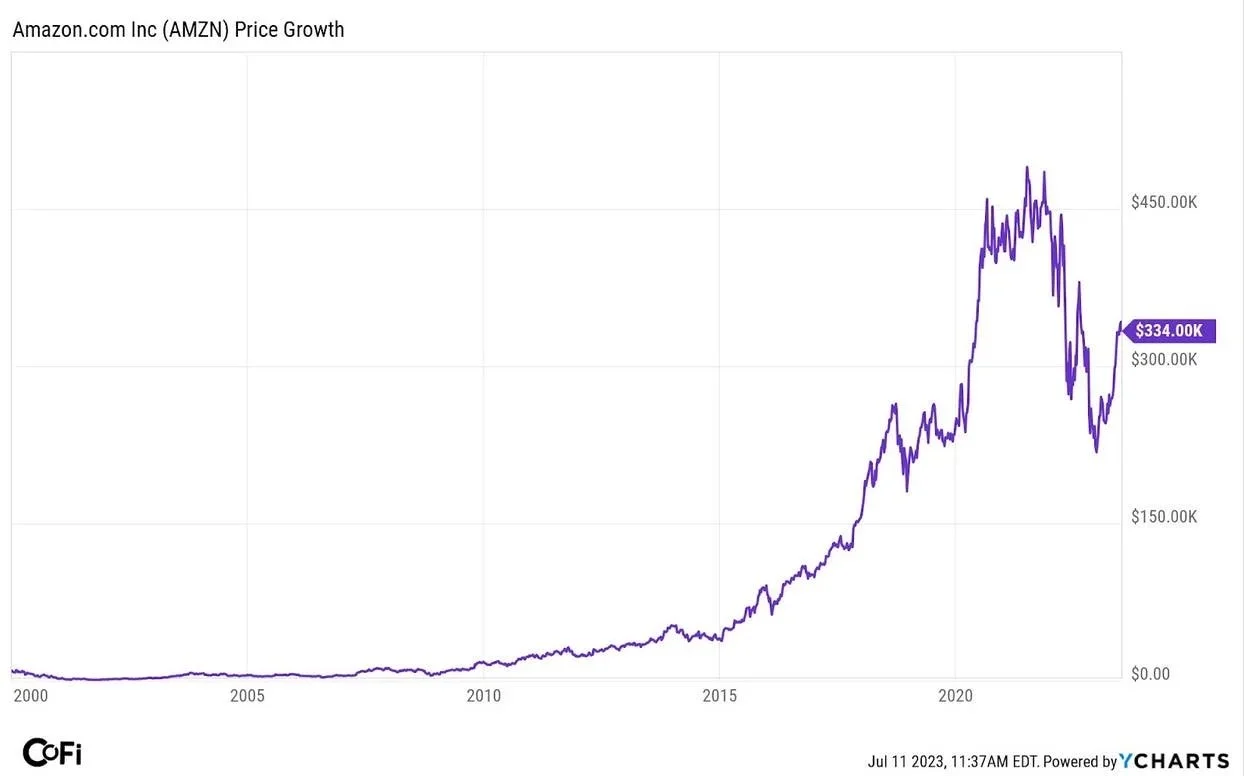 This seems somewhat obvious when it comes to stocks, as most of us can easily identify the highest highs and the lowest lows we’ve either experienced personally or been made aware of via the ether of the universe. Ever seen one of those “If You’d Invested $10,000 in Amazon in 2000” headlines? They’re usually accompanied by a chart like this:
