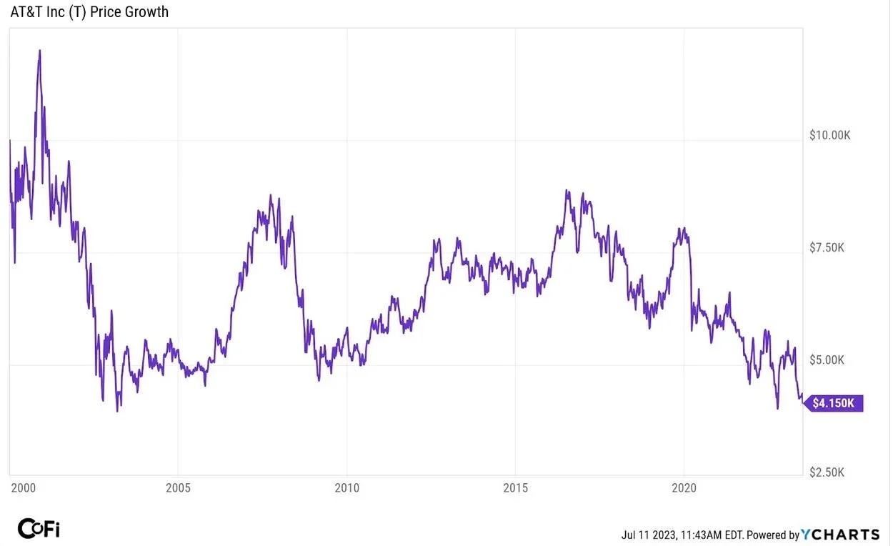 For whatever reason (probably geography) I have a number of clients who own shares of AT&T. Some of them for a very long time. Like generationlaly long. It was a great stock for their parents, so they won’t let go of it, even though it hasn’t been a great stock for them. Here’s how AT&T has done since that January 1st, 2000 start date: