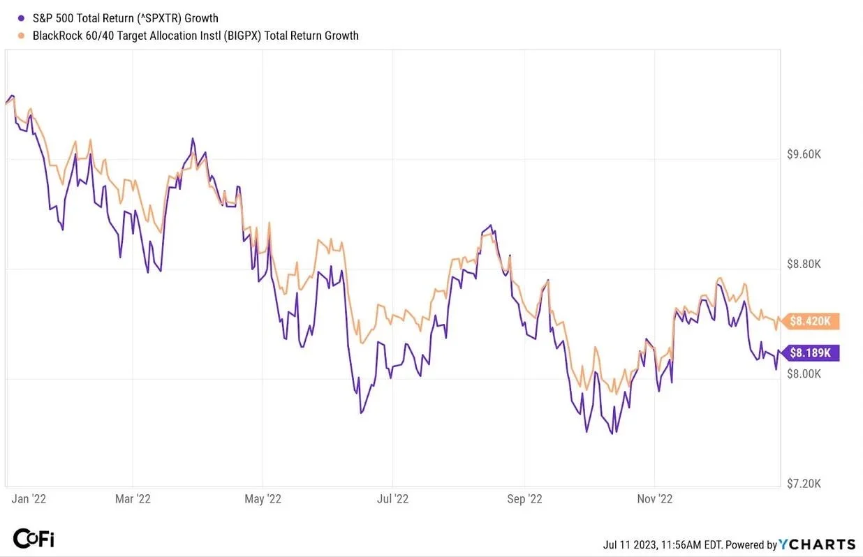 The gold line is the 60/40 portfolio this time, but honestly, you could be color-blind and realize the returns aren’t all that different between a 100% stock portfolio and a 60% stock portfolio.
