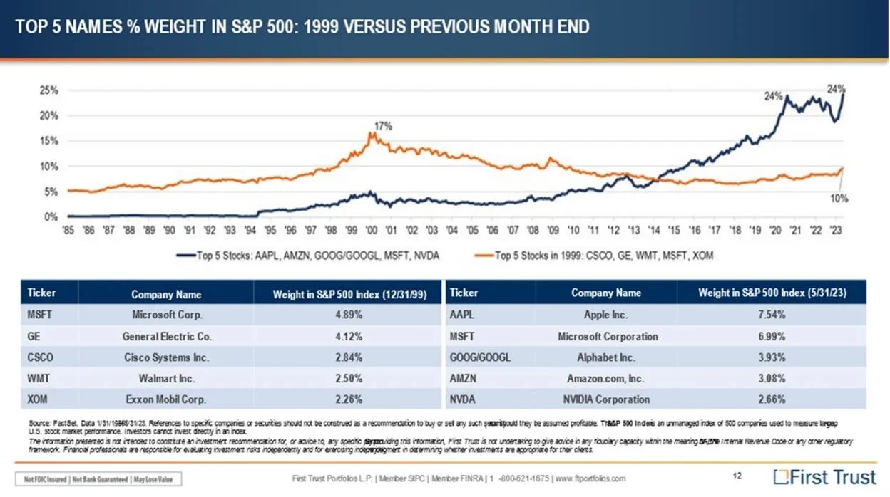 Here’s a chart from our partners at First Trust, comparing the top 5 names in the S&P 500 at the turn of the century to the top 5 names now, as well as their impact on the return of the market: