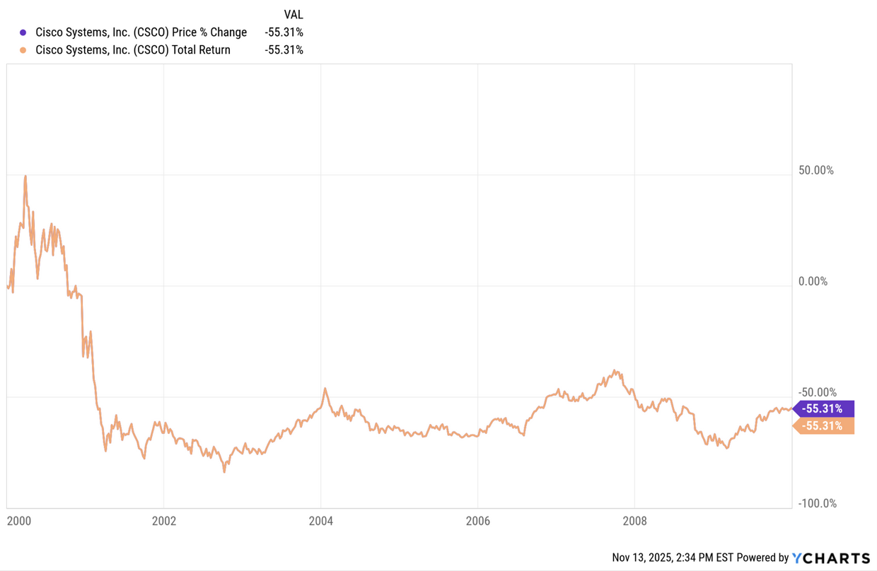 Cisco plunged over 50% in a matter of months. Then kept falling. Things had gone too far, too fast. The classic story of irrational exuberance meeting the cold reality of gravity.