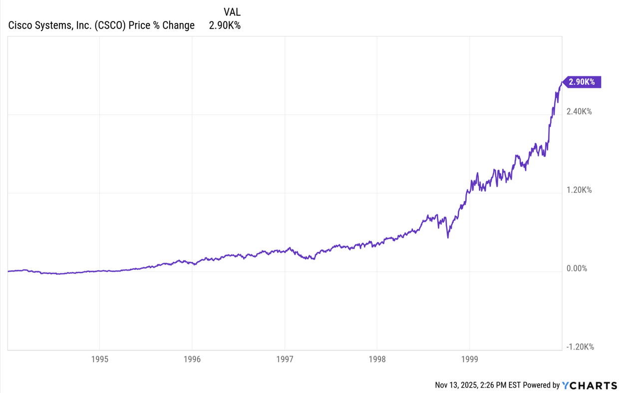 In 1995, Cisco traded at a reasonable P.E. ratio in the 20s – expensive, but justifiably so. By 1999, as the dot-com frenzy accelerated, that ratio had ballooned. At its peak in March 2000, Cisco's P.E. ratio nearly cracked 200.